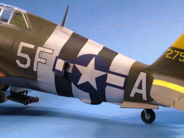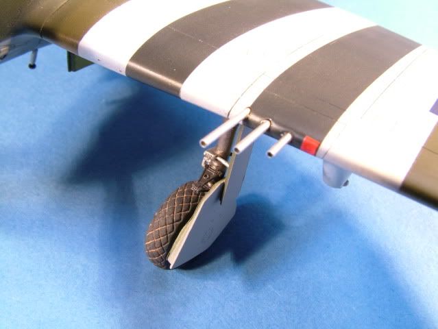The most prominent feature of this particular scheme are the D-Day invasion recognition bands and the yellow marker bands, plus the Red/White/Blue Squadron Nose markings. The canopy frame was left in a natural metal finished state.
